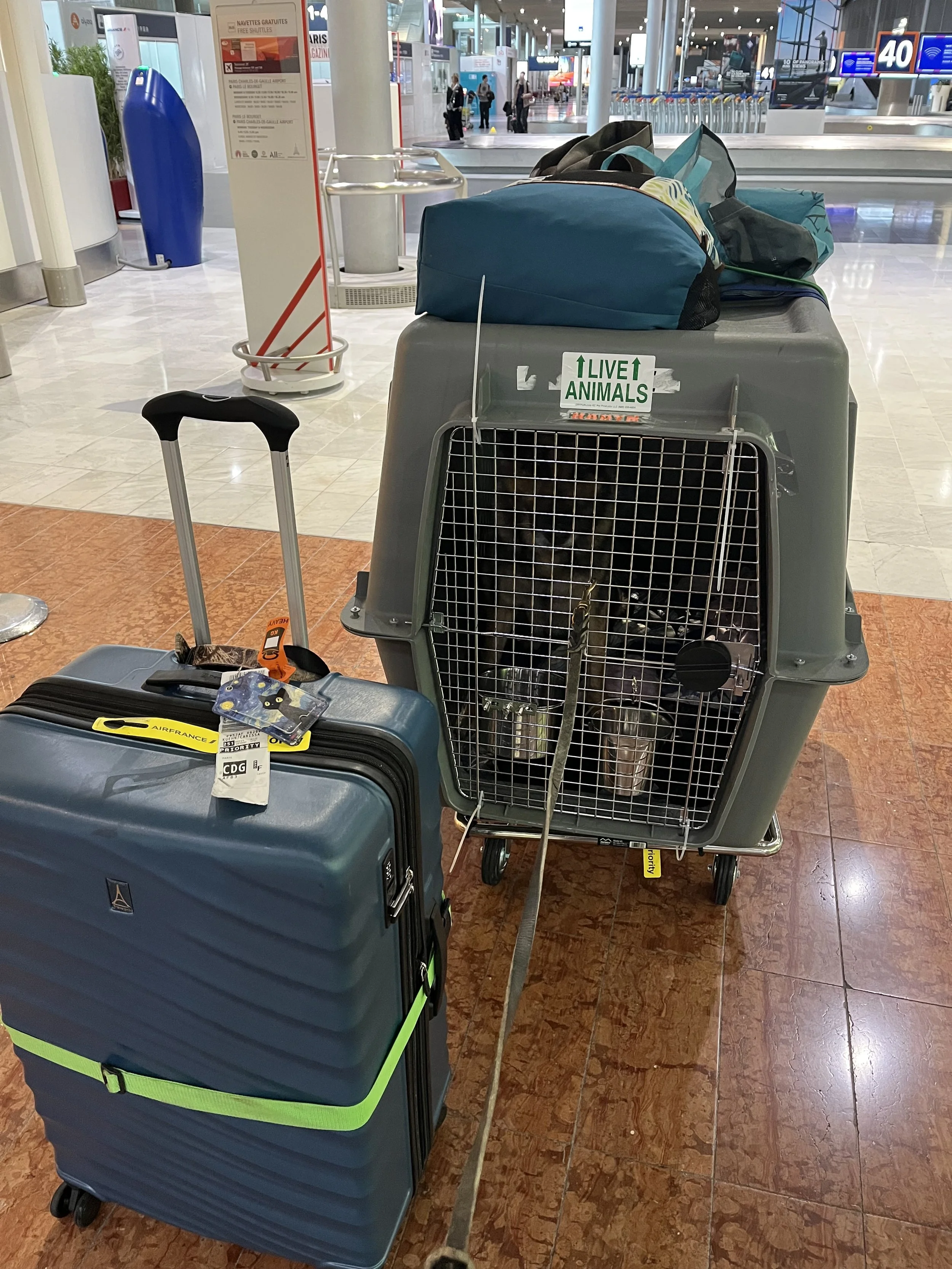 Check-in was a breeze, thanks to the wonderful staff at Air France. They took care of us separately from everyone else, reviewing Hadyn’s paperwork, affixing more stickers to his kennel, and checking in my bags. We wheeled Hadyn’s crate through the airport over to TSA, while Hadyn walked on leash beside us. After the TSA inspection, I loaded Hadyn up in the crate, zip-tied the door, then waved good-bye while they wheeled him away to be loaded onto the plane.